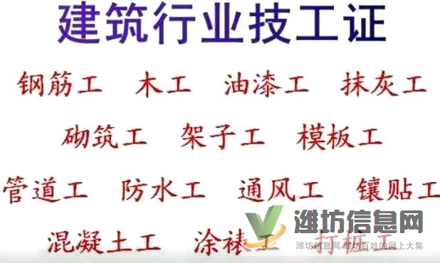 電焊工、建筑電工、弱電工、木工、石工、模板工、機械設備安裝工、電氣設備安裝調試工、樁機操作工、除塵工、抹灰工、油漆工、鑲貼工、涂裱工、通風工、管道工、測量放線工、起重信號工、砌筑工、鋼筋工、架子工、混凝土工、防水工、手工木工等幾十個工種。